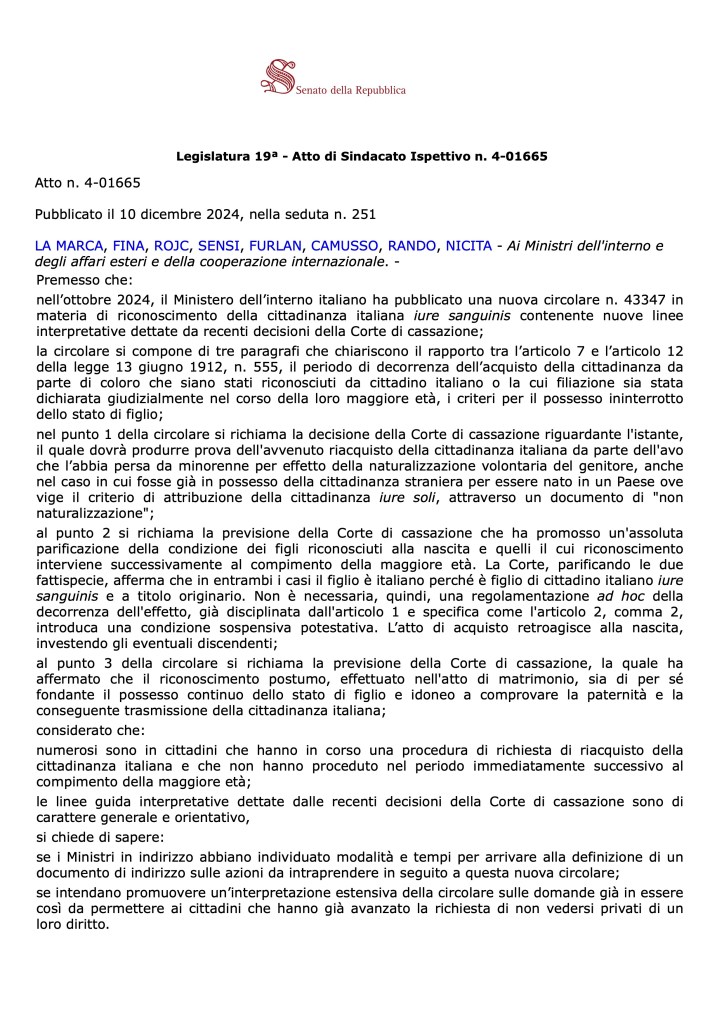In questi giorni, la Sen. La Marca ha depositato un’interrogazione parlamentare [https://www.senato.it/japp/bgt/showdoc/showText?tipodoc=Sindisp&leg=19&id=1438607] rivolta ai Ministri dell’Interno e degli Affari Esteri, chiedendo chiarimenti urgenti e azioni concrete in seguito alla nuova circolare pubblicata dal Ministero dell’Interno italiano il 3 ottobre 2024 [http://www.libertaciviliimmigrazione.dlci.interno.gov.it/sites/default/files/allegati/circolare_43347_del_3_ottobre_2024.pdf], riguardante il riconoscimento della cittadinanza italiana iure sanguinis. La circolare, che contiene nuove linee interpretative dettate dalle recenti decisioni della Corte di Cassazione, solleva dei cambiamenti importanti nella procedura dell’acquisto della cittadinanza.