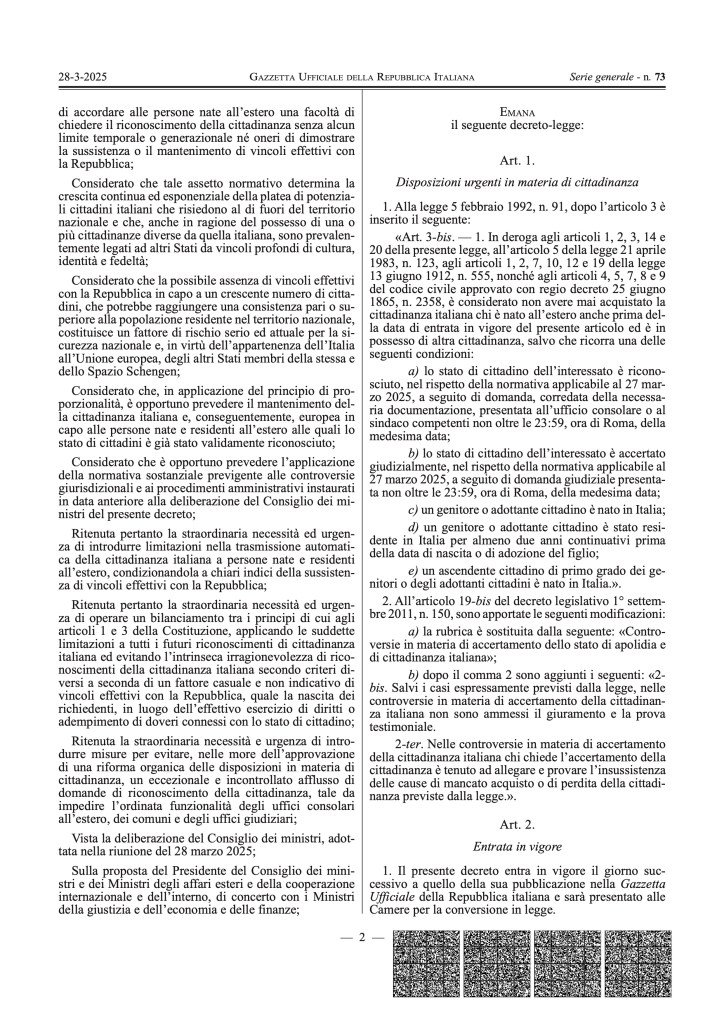 La nuova normativa prevede che, d’ora in avanti, saranno cittadini italiani dalla nascita solo coloro che hanno almeno un genitore, un nonno o una nonna nati in Italia. Le generazioni successive non avranno più il diritto automatico alla cittadinanza, anche se la catena di discendenza non è stata interrotta. Inoltre, i discendenti di italiani nati all’estero potranno ottenere la cittadinanza solo se uno dei genitori ha vissuto in Italia per almeno due anni prima della loro nascita.