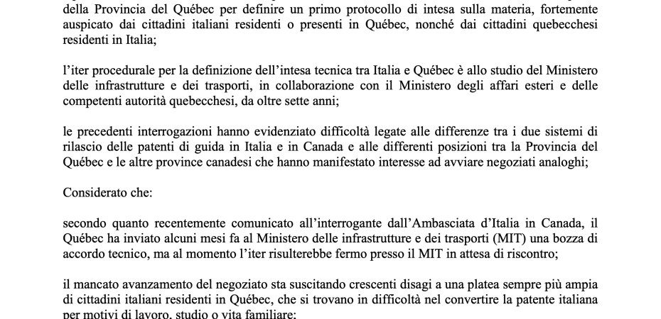 “Dal 2017 – insiste La Marca – esiste un accordo quadro tra Italia e Canadache stabilisce le linee guida per la conversione delle patenti ma per completare l’iter sono necessari protocolli tecnici con le singole Province. Mentre altre Province stanno avanzando nelle trattative, il Québec – dove vive una comunità italiana ampia e radicata – resta bloccato a causa dell’immobilismo del nostro Ministero delle Infrastrutture e dei Trasporti”.